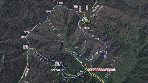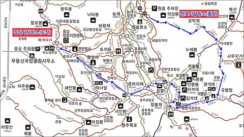 고기리 3거리<3.1km>큰고리봉<3.1km>세걸산<0.5km>헬기장(샘터)<0.1km>세동치<1.7km>부운치<0.2km>헬기장(부운봉)<1.5km>팔랑치<1.4km>바래봉 3거리<0.2km>샘터<0.4km>바래봉<0.6km>바래봉 3거리<2.2km>운봉<1.7m>용산주차장 [약 16km]